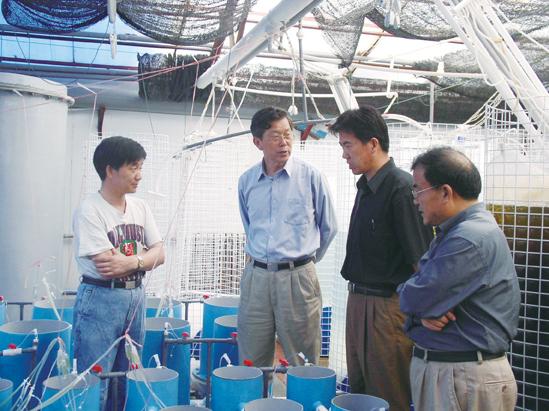 唐啟升院士(左二)與科研人員在現(xiàn)場(chǎng)討論貝類育苗設(shè)施實(shí)驗(yàn)情況