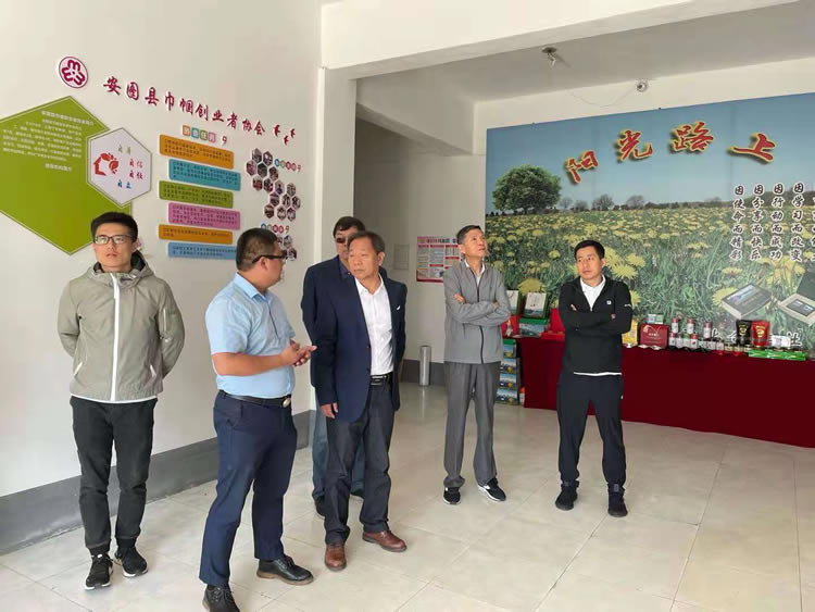 白啟云理事長(zhǎng)(右三)在新合鄉(xiāng)恒源蒲公英合作社參觀指導(dǎo)工作