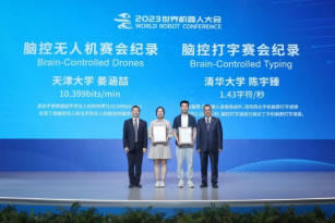 本屆大會產(chǎn)生了兩項紀(jì)錄,分別是2023世界機器人大會腦控打字、腦控?zé)o人機賽會記錄,北京市經(jīng)濟(jì)和信息化局黨組書記、局長姜廣智,北京經(jīng)濟(jì)技術(shù)開發(fā)區(qū)管委會主任孔磊為兩項紀(jì)錄創(chuàng)造者頒發(fā)證書。