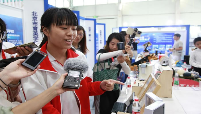 北京大學(xué)附屬中學(xué)學(xué)生講解自己發(fā)明的紙殼機(jī)器人