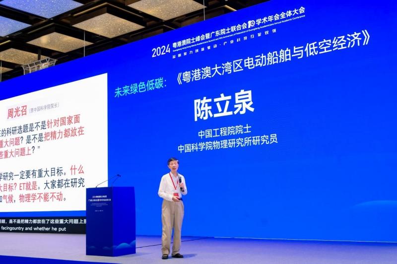 中國工程院院士、中國科學(xué)院物理研究所研究員陳立泉帶來《粵港澳大灣區(qū)電動(dòng)船舶與低空經(jīng)濟(jì)》專題報(bào)告。