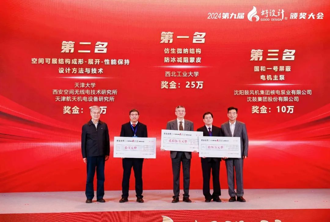 潘云鶴院士與浙江雙環(huán)傳動(dòng)機(jī)械股份有限公司董事長吳長鴻先生共同為2024“好設(shè)計(jì)”獎(jiǎng)前三名的項(xiàng)目頒發(fā)獎(jiǎng)金。仿生微納結(jié)構(gòu)防冰減阻蒙皮、空間可展結(jié)構(gòu)成形-展開-性能保持設(shè)計(jì)方法與技術(shù)、國和一號(hào)屏蔽電機(jī)主泵三個(gè)項(xiàng)目分別獲得25萬、15萬和10萬元獎(jiǎng)金。