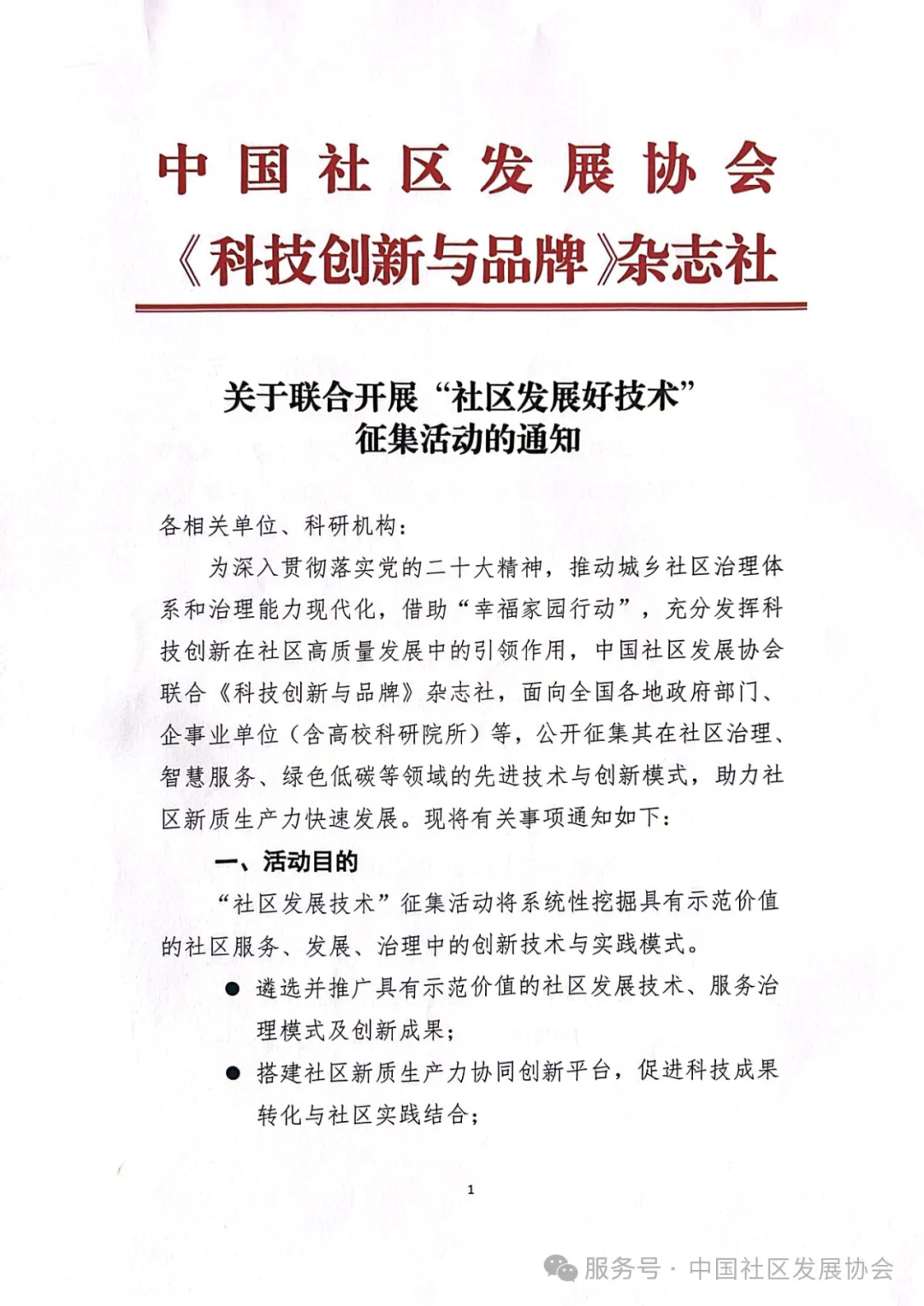 為深入貫徹落實黨的二十大精神,推動城鄉(xiāng)社區(qū)治理體系和治理能力現(xiàn)代化,借助“幸福家園行動”,充分發(fā)揮科技創(chuàng)新在社區(qū)高質(zhì)量發(fā)展中的引領(lǐng)作用,中國社區(qū)發(fā)展協(xié)會聯(lián)合《科技創(chuàng)新與品牌》雜志社,面向全國各地政府部門、企事業(yè)單位(含高??蒲性核?等,公開征集其在社區(qū)治理智慧服務(wù)、綠色低碳等領(lǐng)域的先進技術(shù)與創(chuàng)新模式,助力社區(qū)新質(zhì)生產(chǎn)力快速發(fā)展?,F(xiàn)將有關(guān)事項通知如下: